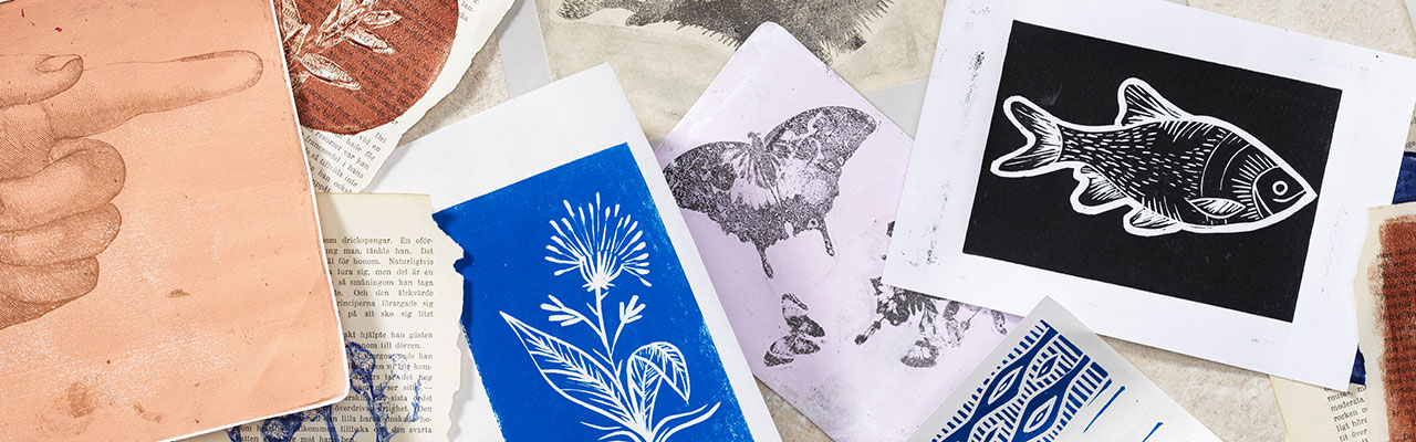 Trykteknikk er en nem måde at skabe mønstre på stof eller papir og lave dine egne print til billeder eller kort. Du kan bruge alt fra kartofler til linoleum og geléplader eller stencils til at lave tryk. Du kan printe på alt fra tekstiler til papir, træ eller lærred og meget mere. Brug en blæk, der passer til den overflade, du vil printe på, og fiksér den om nødvendigt. Tag med os ind i den kreative verden af print!