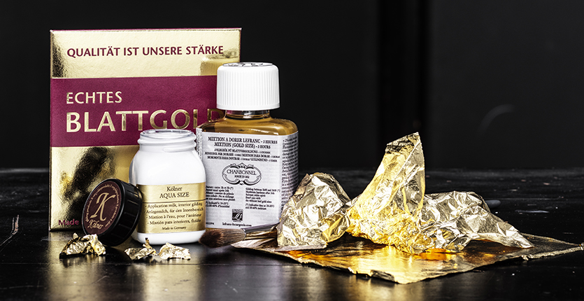 Hvis du vil have et ekstra luksuriøst look på dit maleri, kan du bruge enten bladguld eller bladmetal til at skabe gyldne effekter. Bladmetal er et meget fint metal, der er hamret meget tyndt ud, hvilket giver den karakteristiske tynde og skøre struktur, som man let kan brække i stykker. Bladguld plejer at være i en dyrere prisklasse, da det ofte er lavet af 22-24 karat guld. Det holder sig også godt over tid, da guld ikke oxiderer eller ændrer farve.