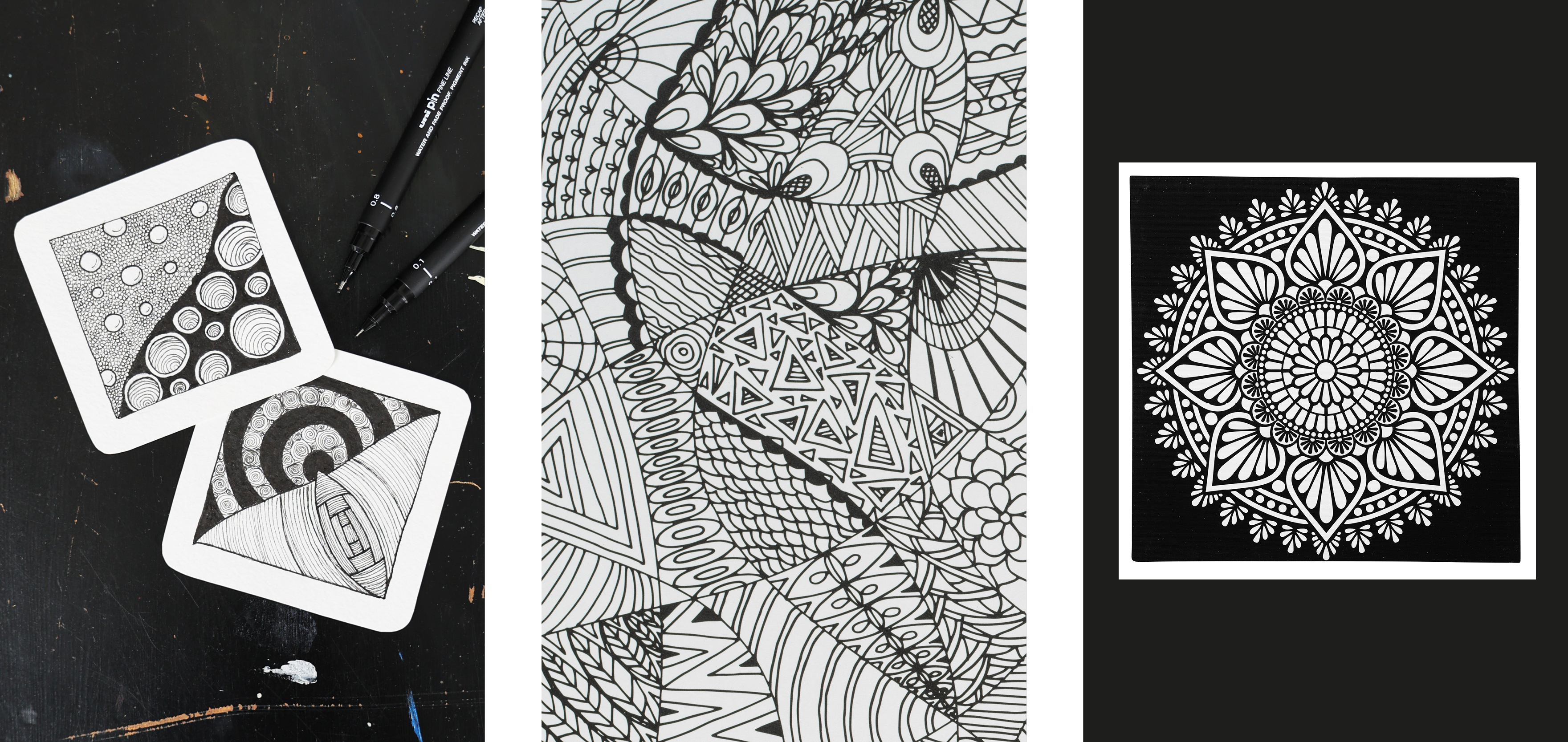 Zentangle-teknikken er baseret på mindfulness, og hvordan man kan slappe af ved at tegne gentagne og grafiske mønstre på en mindre flade. Det er en teknik, der har en masse faste regler, som man skal følge for virkelig at få succes med sin "zentangle". Du skal bruge et lille stykke papir af høj kvalitet (89 mm) og markere hvert hjørne ca. 1 cm inde, så det bliver en hvid ramme omkring din kommende doodle. Derefter inddeler du din overflade i "strings" ved at tegne lige eller buede linjer, så du har sektioner at arbejde med. Dernæst begynder du på dine forskellige "tangles", som er grafiske elementer og mønstre, der kan ses fra alle vinkler. Hvis du vil lære endnu mere om zentangle-metoden, kan du besøge ophavsmandens hjemmeside her.