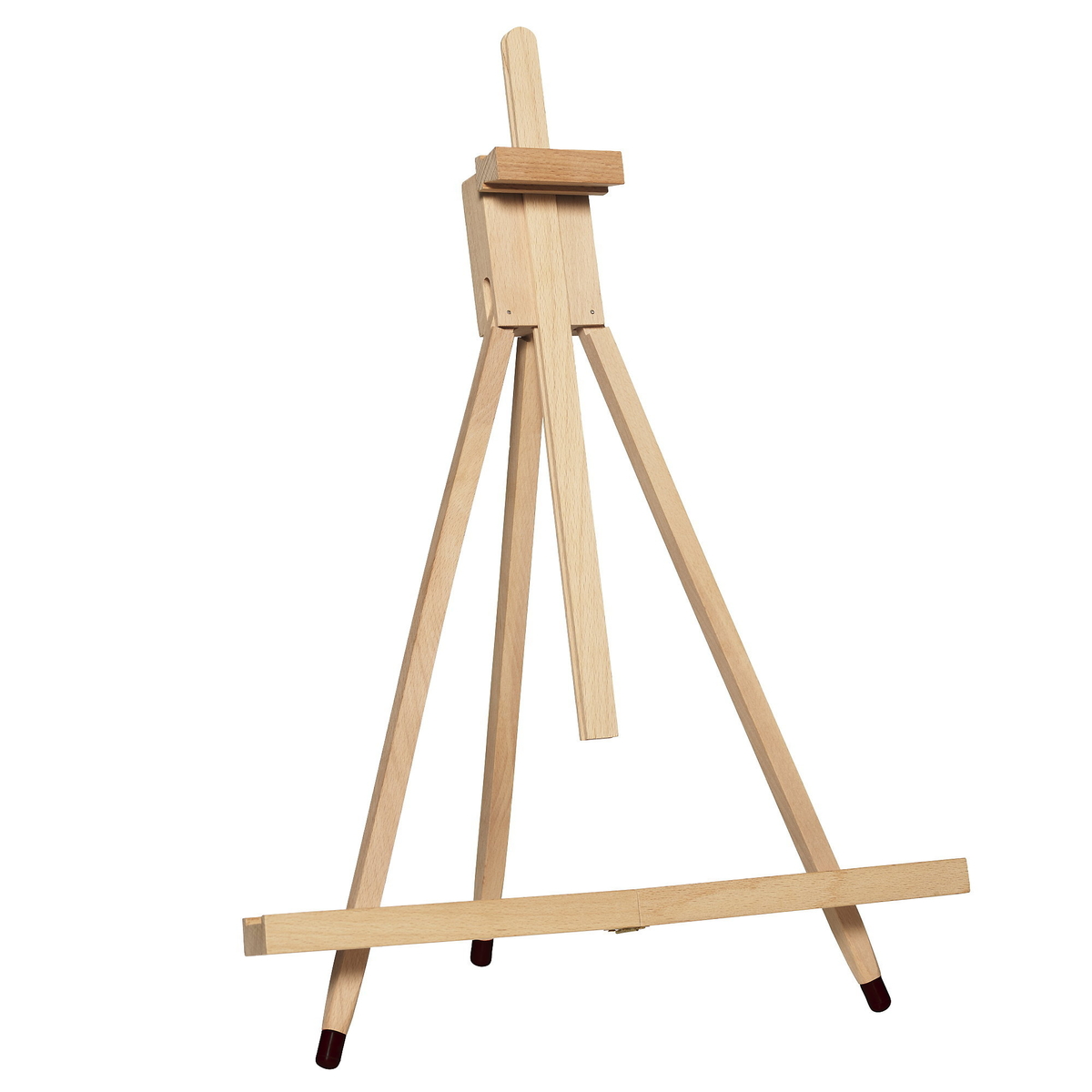 Selve canvasholderen er 2,2 cm dyb og maks. højde på et lærred, du kan sætte og spænde i staffeliet er 65 cm. Støtten kan hæves og sænkes og tages helt af, når man maler på f.eks. lærred eller akvarel fastgjort på krydsfiner eller træplader. Fremstillet af lyst, slebet bøgetræ. Alle 3 ben er forsynet med gummifødder.