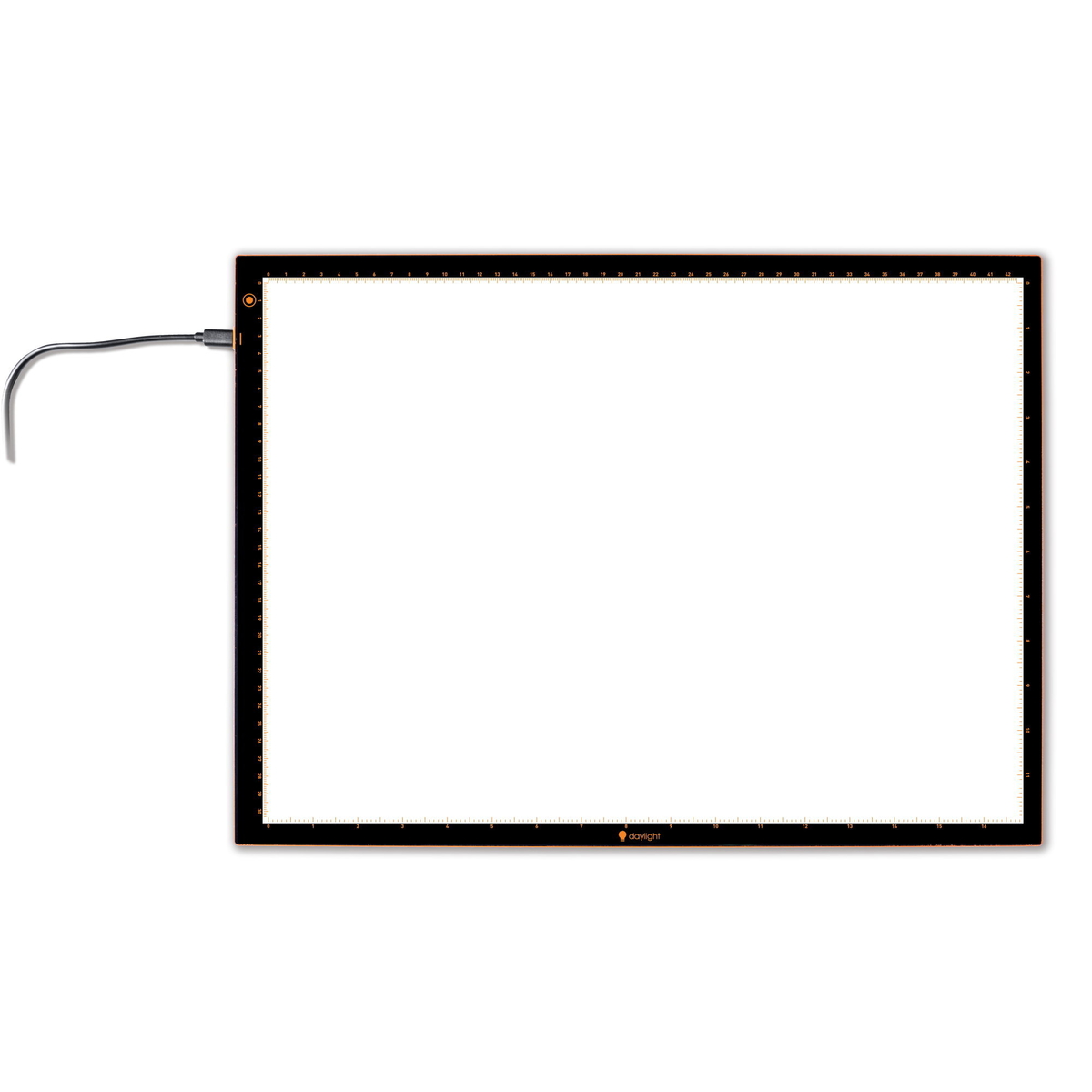Konstruktionen er tynd og let i vægt uden at give afkald på stabilitet. Lyset kan indstilles i 3 forskellige styrker, og langs arbejdsoverfladen er der målangivelser i cm og inches. Lysbordet sluttes til strøm via det medfølgende USB-kabel.