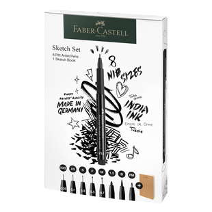 Sættet indeholder følgende penne: XXS 0,05 / XS 0,1 / S 0,3 / F 0,5 / M 0,7/1,5 mm samt 1 pen med penselspids og 1 pen med Fude Medium-spids (japansk penselspids). Den medfølgende skitseblok måler 14,3×22 cm og indeholder 20 ark med en gramvægt på 140.