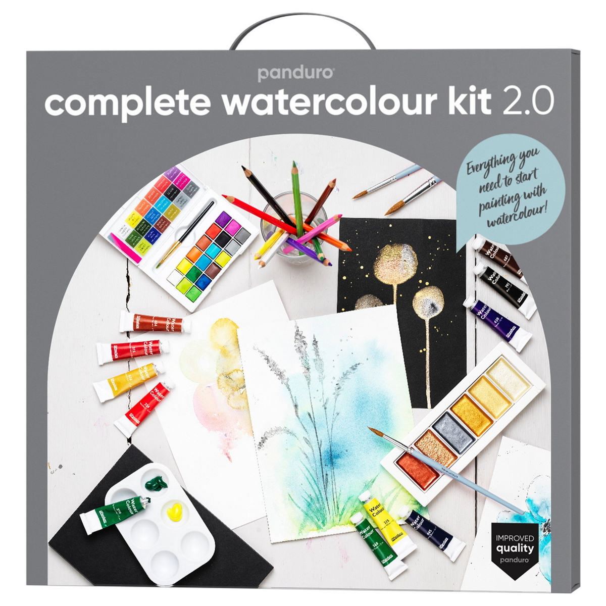 - Masser af akvarelfarver! 12x12 ml flydende akvarelfarve i tuber, 18 akvarelfarver i halve kopper i praktisk etui med tilhørende pensel, 6 akvarelfarver med metallicglans, som kommer mest til sin ret på blokken med sorte ark – og 12 akvarelblyanter.
