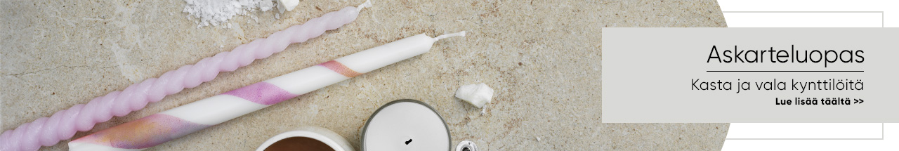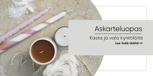 Oletko jo tutustunut uuteen kynttiläkouluumme? Sieltä löydät kaiken mitä sinun tulee tietää kynttilöiden kastamisesta tai valamisesta sekä saat vinkkejä koristeluun ja ohjeita valmiiden steariinikynttilöiden maalaamiseen ja tekstein koristelemiseen. Vala kynttilöitä ja lisää niihin hurmaavaa kanelintuoksua, joka luo joulutunnelmaa koko kotiin. Täältä löydät kynttilämassat mehiläisvahat, soijavahat, joulukuusikynttilät, sydänlangat ja kynttilänpidikkeet omien joulukynttilöiden valmistamiseksi. Meillä on tietenkin myös jouluvaloja ja valosarjoja, joilla voit valaista ikkunat ja pienet joulumaisemat tunnelmallisena jouluaikana. Anna joulurauhan laskeutua tunnelmallisen valaistuksen myötä.