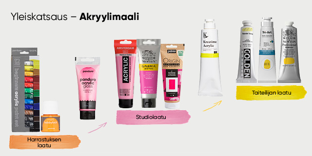 Akryylimaaleja on eri laatuisia ja siksi eri hintaluokissa. Ne eroavat toisistaan pigmenttien laadun ja värin sisältämän pigmentin määrän perusteella. Enemmän pigmenttiä tarkoittaa laadukkaampaa ja kalliimpaa väriä. Laadukkaassa akryylivärissä on myös kehittyneempi sideaine, se on erittäin valonkestävä ja säilyttää värin voimakkuuden sekoitettuna mihin tahansa väliaineeseen. Jaamme akryylivärit kolmeen luokkaan: