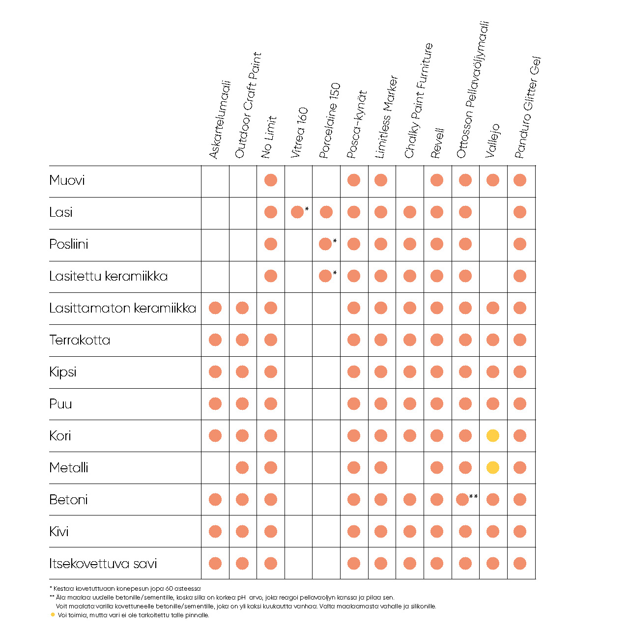 Olemme koonneet tänne tietoa siitä, mikä maali sopii millekin materiaalille – puusta muoviin, lasiin, metalliin, betoniin, saveen. Nyt sinun on helpompi valita oikea maali huonekalujen & sisustustavaroiden maalaamiseen.