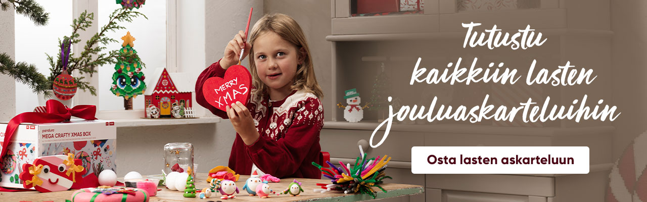 Järjestä joulun paras askarteluhetki Panduron ainutlaatuisten DIY-pakkausten avulla! Kehitämme, suunnittelemme ja kokeilemme DIY-pakkauksiamme kaikin mahdollisin tavoin Malmössä sijaitsevassa askartelupajassamme, ja ainoa mitä sinun tulee hankkia niiden lisäksi, ovat työkalut ja liima. Juuri nyt We are Panduro -jäsenet saavat 33% alennusta kaikista joulun DIY-pakkauksista.