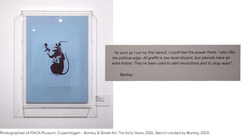 Olet varmasti nähnyt jonkun taiteilija ja aktivisti Banksyn monista näyttävistä maalauksista. Hänen tekniikkoihinsa sisältyy usein spraymaalausta (graffiti) sapluunojen avulla. Työt ovat usein mustavalkoisia, joskus mukana on punainen korostusväri. Aiheet ovat voimakkaita, ja niissä on usein kriittistä huumoria sekä muun muassa sodan ja kapitalismin vastaisia sävyjä. Hänen maalaamansa hahmot ovat usein varusmiehiä, poliiseja, rottia, sotilaita, apinoita, vanhuksia ja lapsia.