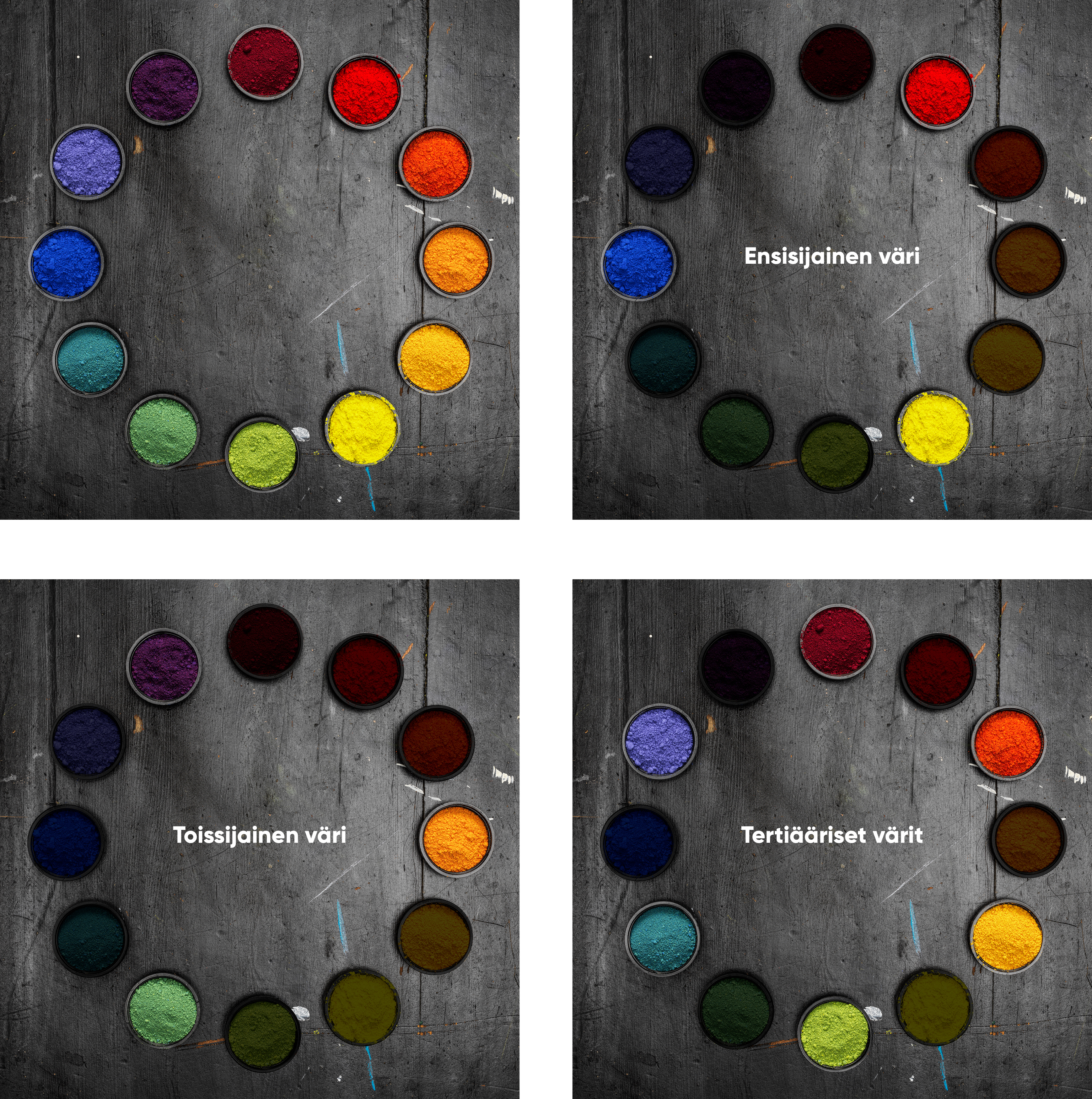 Välivärit – Sekoittamalla kahta pääväriä saat välivärin. Jos esimerkiksi sekoitat sinistä ja keltaista, saat vihreän sävyn. Tyypillisiä välivärejä ovat oranssi, liila ja vihreä.