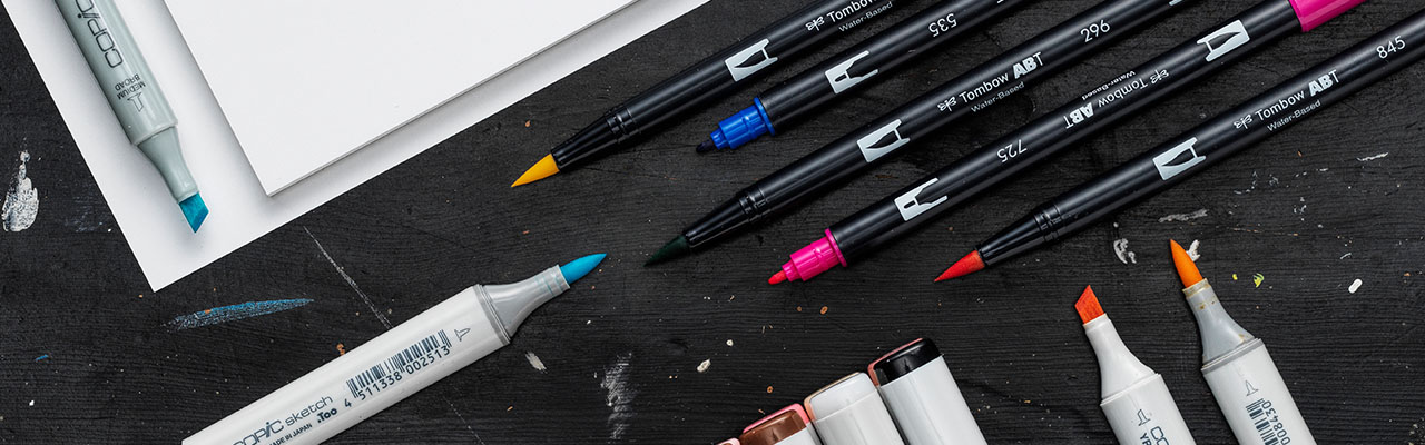 Runsaspigmenttiset kynät vai pehmeät sivellinkärjet? Marker-kynät ja tussit sopivat erinomaisesti graafisten kuvitusten luonnosteluun sekä eloisien piirustusten värittämiseen. Monissa marker-kynissä on kaksi kärkeä, joten saat molempien maailmojen parhaat puolet – samassa kynässä. Marker-kynillä saat aikaan myös jännittäviä asteittaisia tehosteita varjostamalla ja yhdistämällä eri sävyjä.