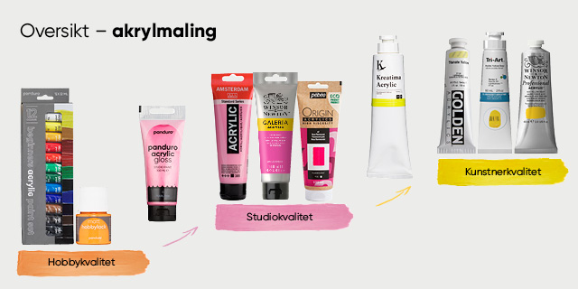 Akrylmaling finnes i forskjellige kvaliteter og dermed forskjellige prisklasser. Det som skiller dem er hvor kvalitative pigmentene er og mengden pigment som malingen inneholder. En større mengde pigment betyr høyere kvalitet og at malingen blir dyrere. En akrylmaling av høy kvalitet har også mer avansert bindemiddel, høy lysekthet og beholder fargeintensiteten når den blandes med et hvilket som helst medium. Vi deler akrylmalingene våre inn i tre kvaliteter: