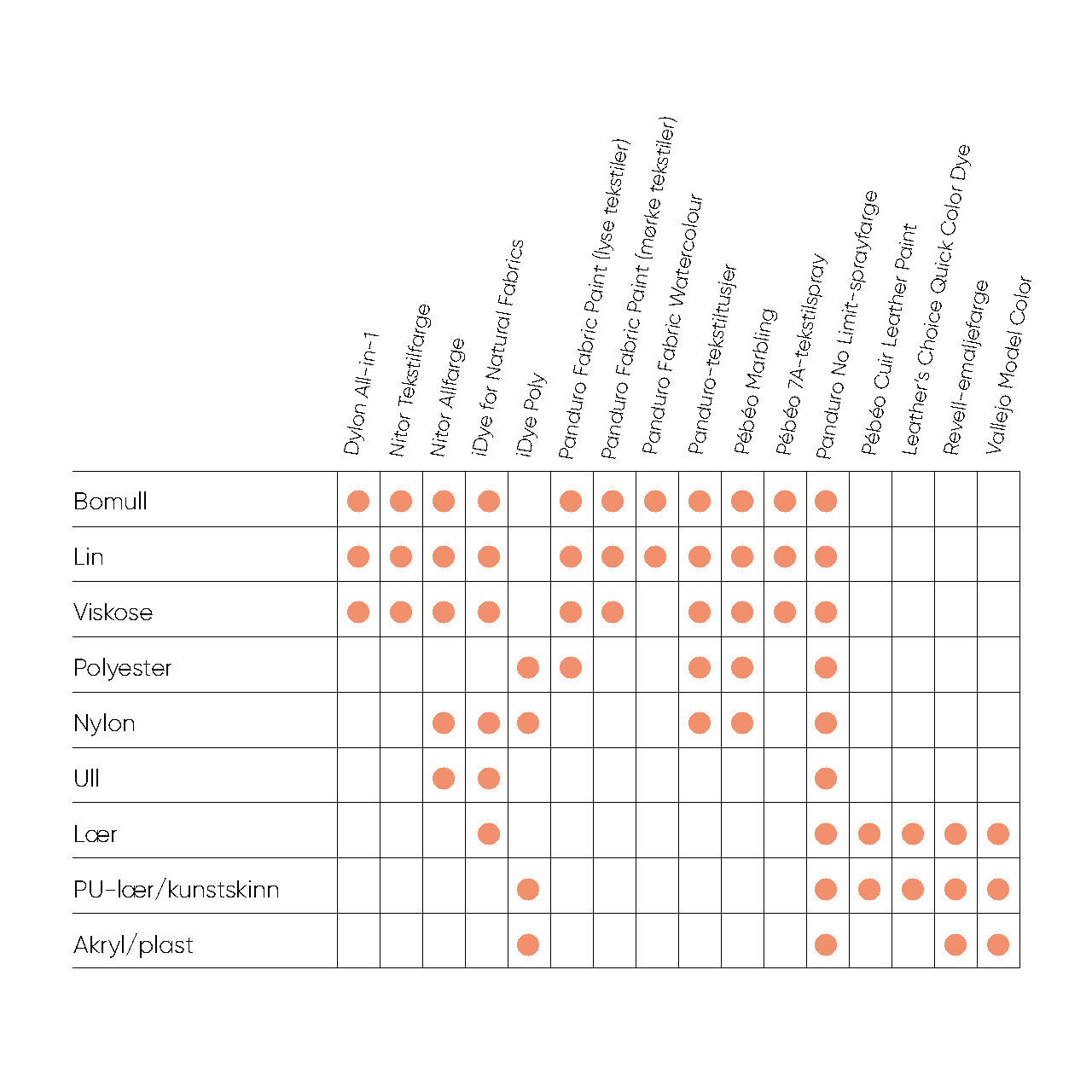 For enkel håndfarging i balje eller kjele på komfyren. Kan brukes til å farge naturmaterialer som bomull, lin, rayon, viskose, bambus, hamp, silke, ull og skinn. Tilsett salt eller eddik avhengig av materialet (ikke inkludert).
