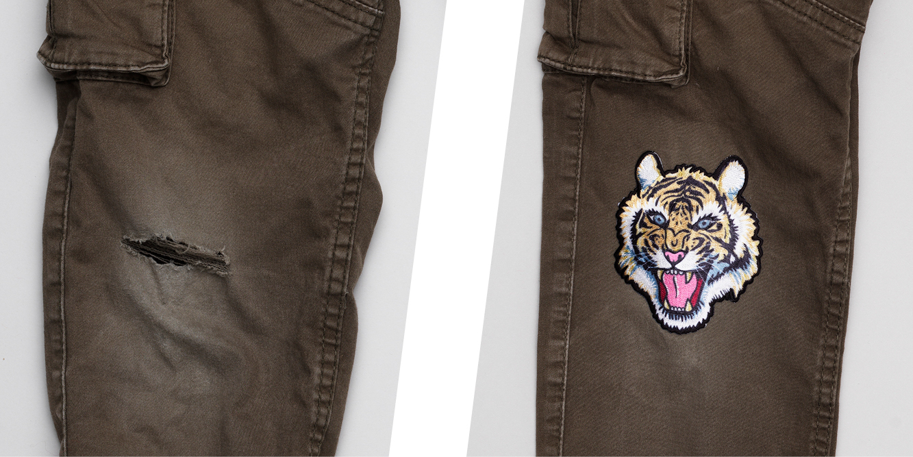 Små hull er lettest å dekke over med broderi eller iron-on. Lapper brukes gjerne til større hull. Eller kombiner begge: Reparer først og lapp etterpå.