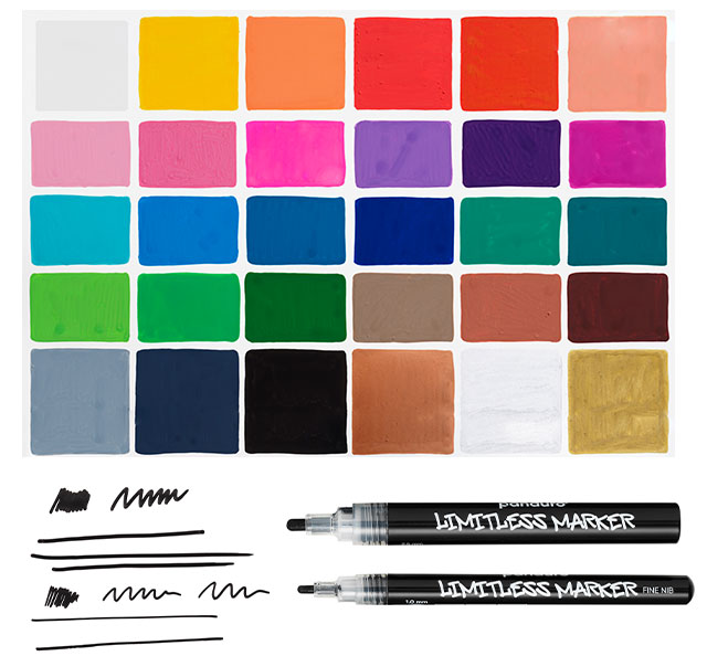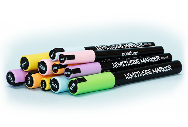 Limitless Markers er Panduros egne vannbaserte akryltusjer – eller akrylpenner, som mange også kaller dem – beregnet for deg som ønsker farge som virkelig synes og dekker ordentlig. Dette er pigmentrike paint markers som gjør det mulig å male lag på lag og skape intense, holdbare resultater på en rekke ulike underlag.