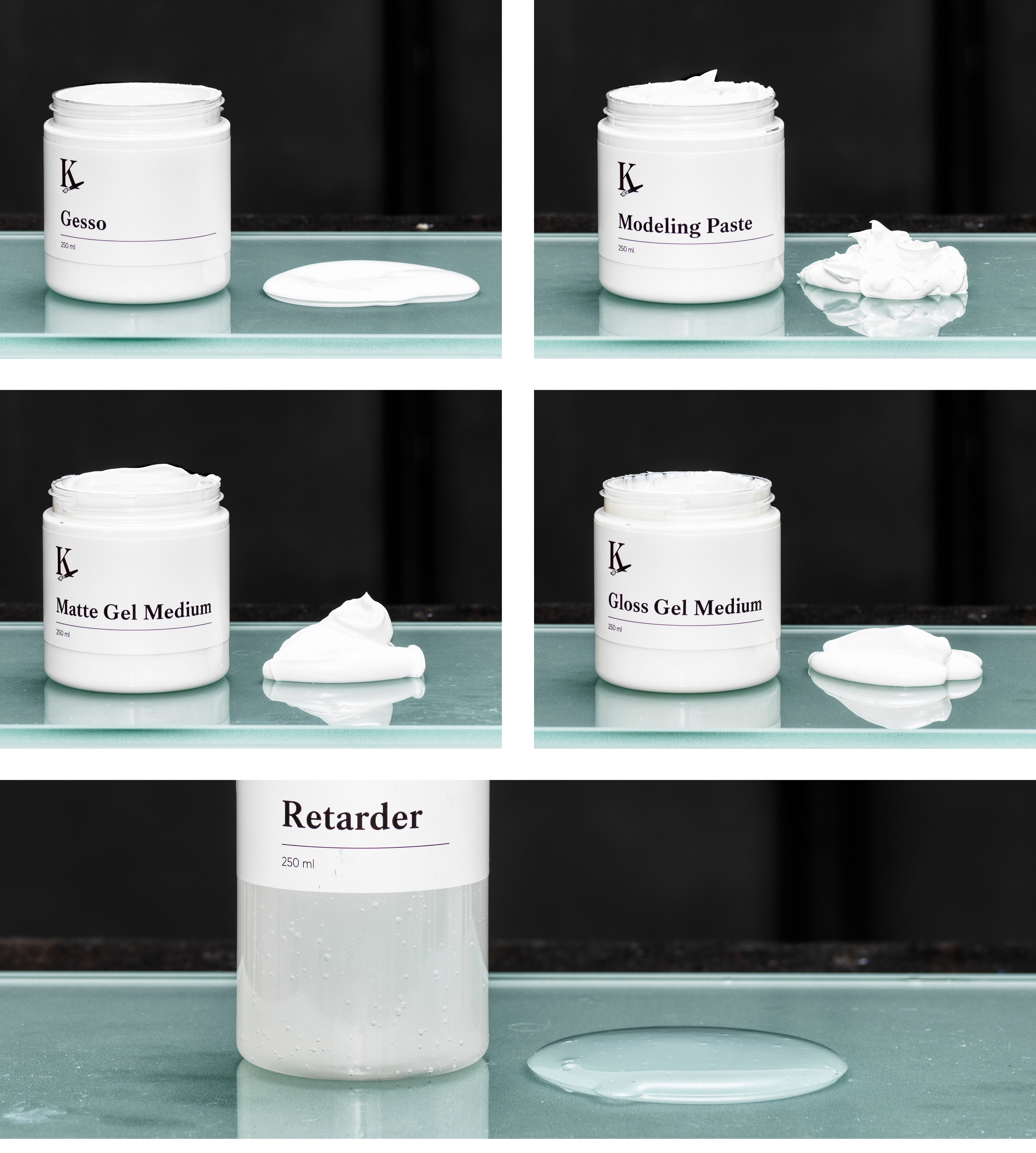 Våre fem akrylmedier i serien Kreatima Acrylic: