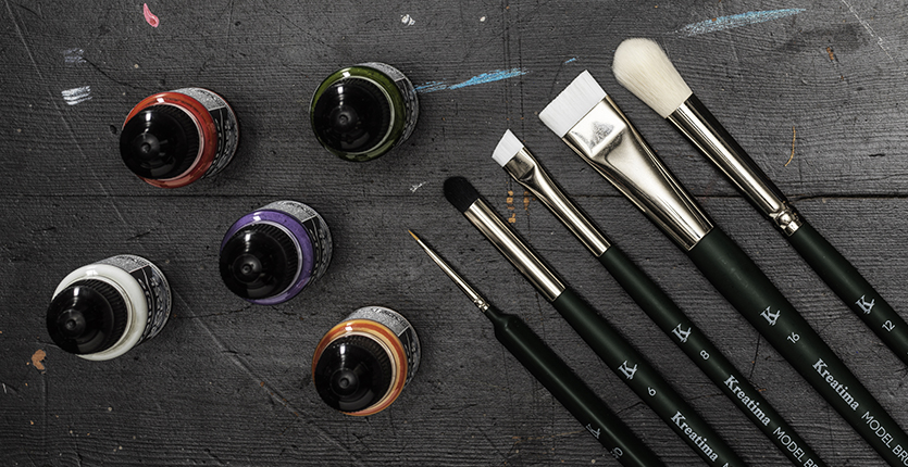 For å virkelig skape variasjon er det også viktig å ha forskjellige pensler klare. En smale og vinklet drybrush kan male større flater, men samtidig gjør formen at den kommer til der det trengs. En myk og rund drybrush er et godt allroundverktøy som kan male overflater og skape tyntflytende effekter. En stivere modelbrush er flott å bruke tørr for å «stemple» og fordele malingen løst.