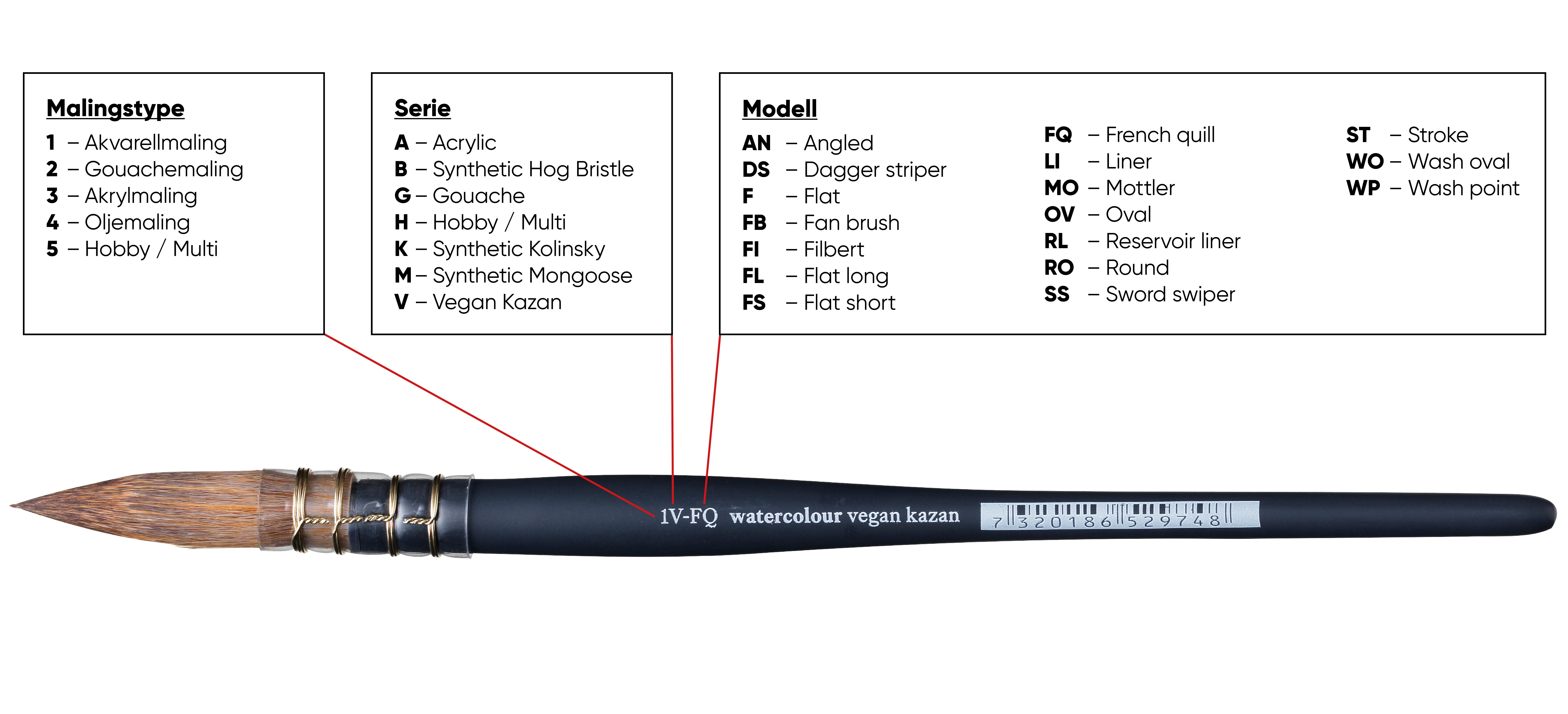 For å gjøre det enkelt å se hvilken pensel du trenger, har vi nå delt inn våre egne Kreatima-pensler i en rekke klassifiseringer. Oppmerksomme kjøpere har lagt merke til at du nå kan finne en kode på tre eller fire tegn på de fleste av våre egne pensler. Koden, atskilt med en bindestrek, for eksempel XX-XX, begynner med et tall som forklarer hvilken maling penselen passer til.