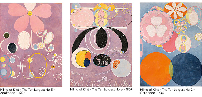 Når du tenker på Hilma af Klint, er det mest sannsynlig noen av maleriene fra serien De ti største, som dukker opp i hodet. Denne serien med bilder, alle med en størrelse på ca. 2,40 x 3,20 meter, skal representere de ulike stadiene i livet, fra barndom til alderdom, og har en fargeskala som gikk i en helt annen retning enn andre verk på den tiden. Barndommen og Voksenlivet, er to verk som er en del av De ti største og er kjente for sine klare farger (unike for tidsperioden) og spesielle former som nesten trollbinder tilskueren.