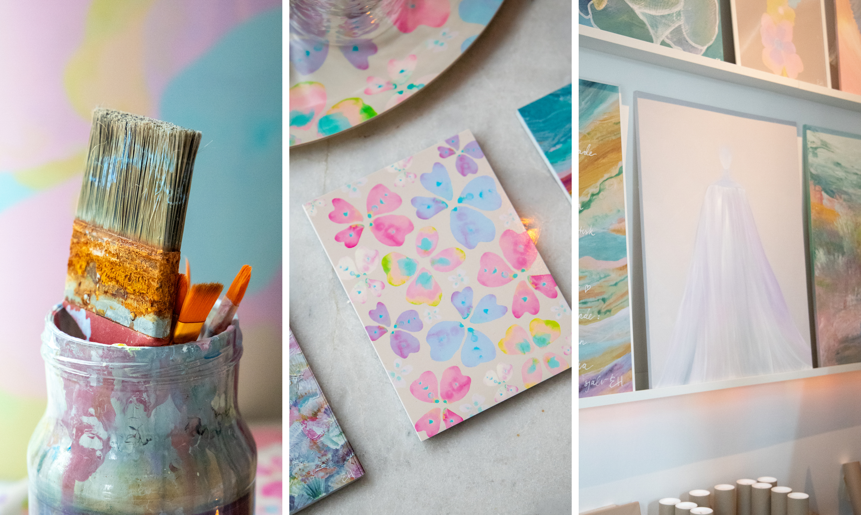 I hennes showroom ser vi ikke bare på vakre originalverk. Her finner vi også plakater, putetrekk og øredobber i hennes signaturfarger. Gjennom akvarellmalerier lager hun alle mønstrene til putetrekkene, som deretter produseres lokalt i Skåne. Nær, men også nærværende, er viktige ord for henne.
