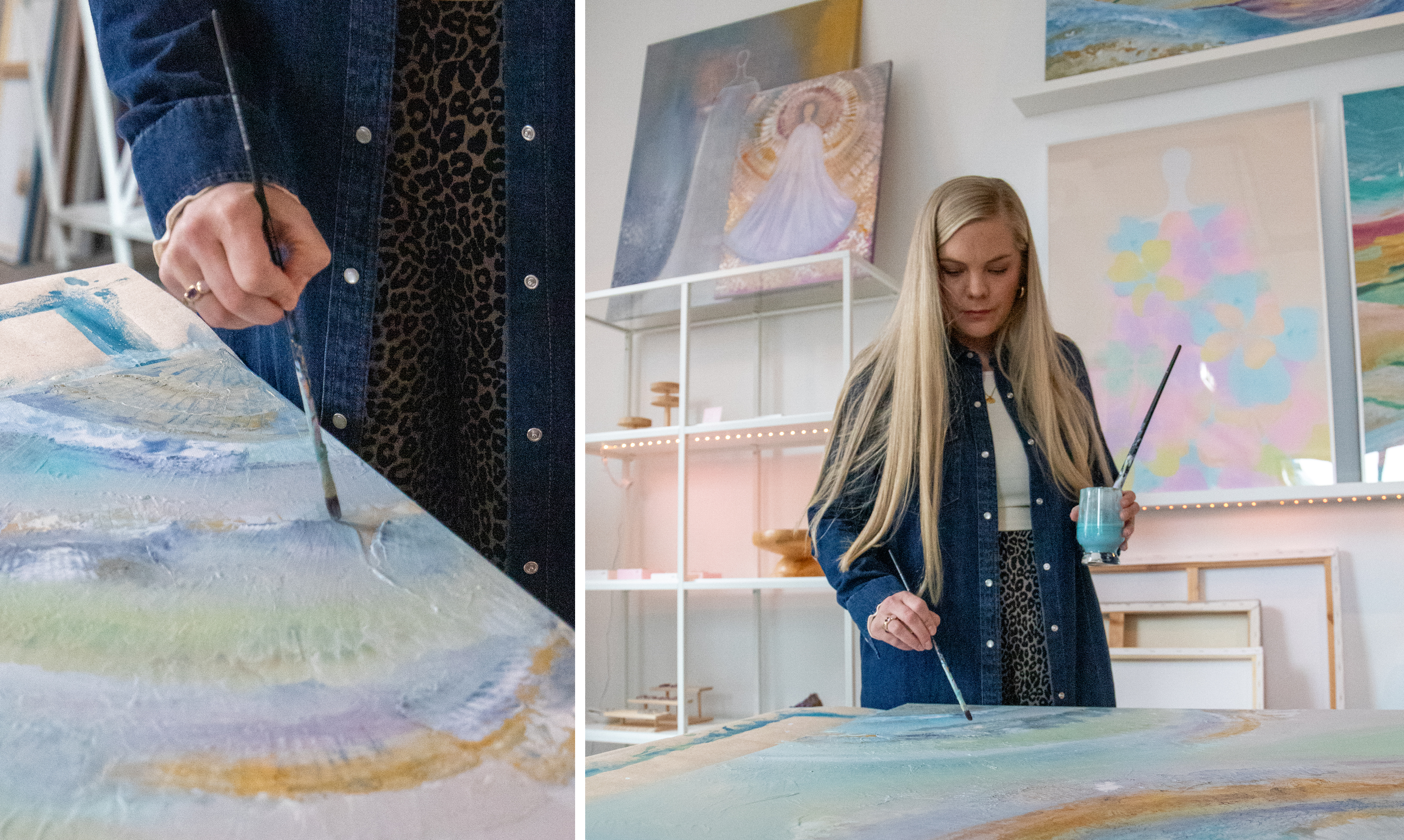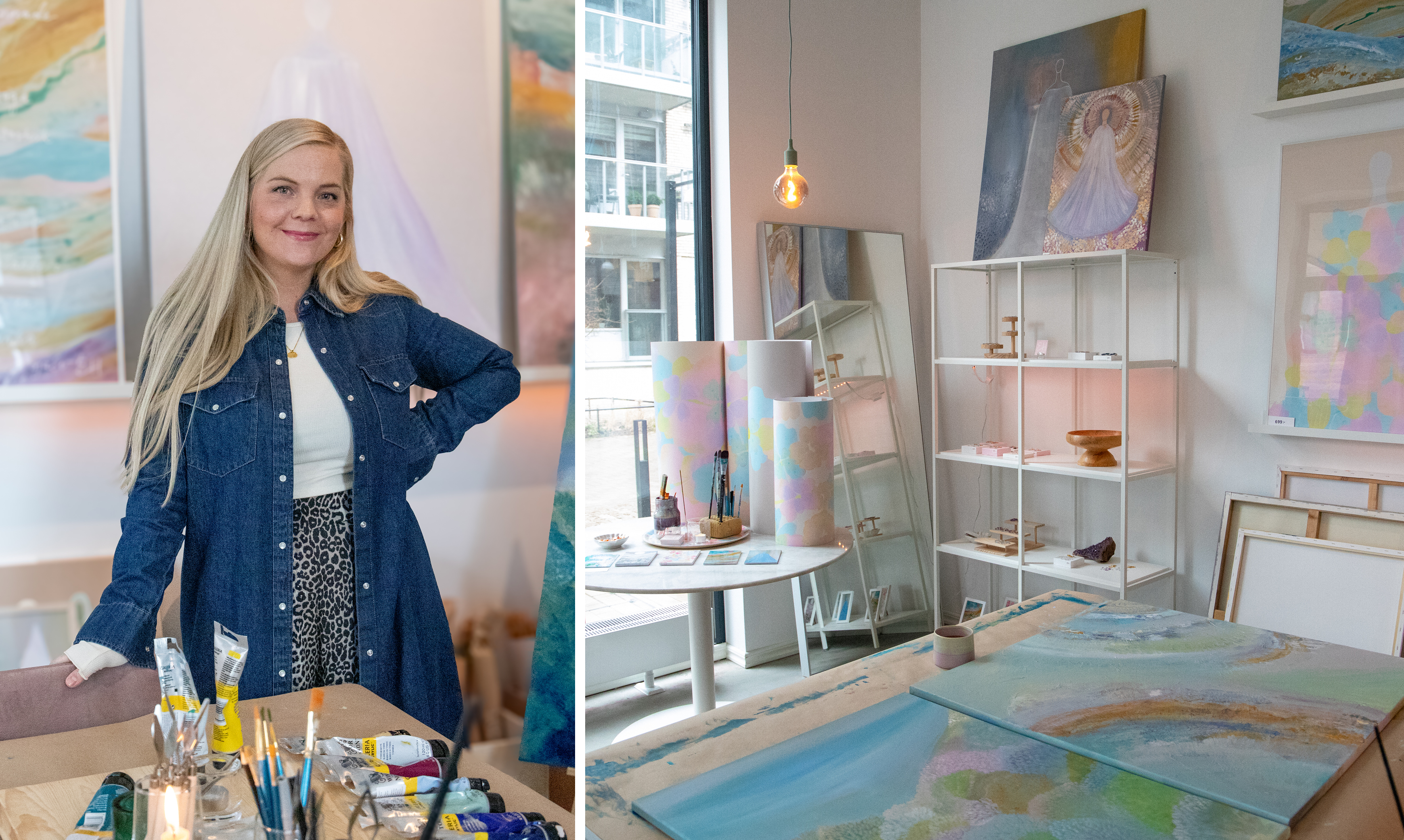 På en grå og regntung dag satte vi kursen mot kunstneren Emma Hiltunens atelier, butikk og showroom. Allerede gjennom de store utstillingsvinduene i lokalene kan vi skimte Emmas fargerike og innbydende arbeider. Når vi går inn, blir vi umiddelbart slått av en harmonisk fargeskala av milde pastellnyanser, fint akkompagnert av beroligende mindfulness-musikk. Det får oss umiddelbart til å glemme det triste været på utsiden. Her møter vi den karismatiske kunstneren Emma Hiltunen, som har funnet fred og ro i meditativ kunst.