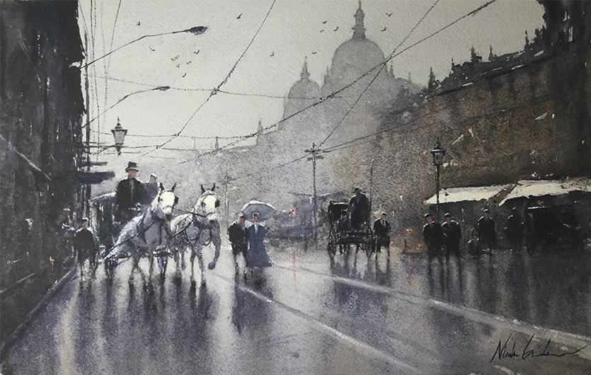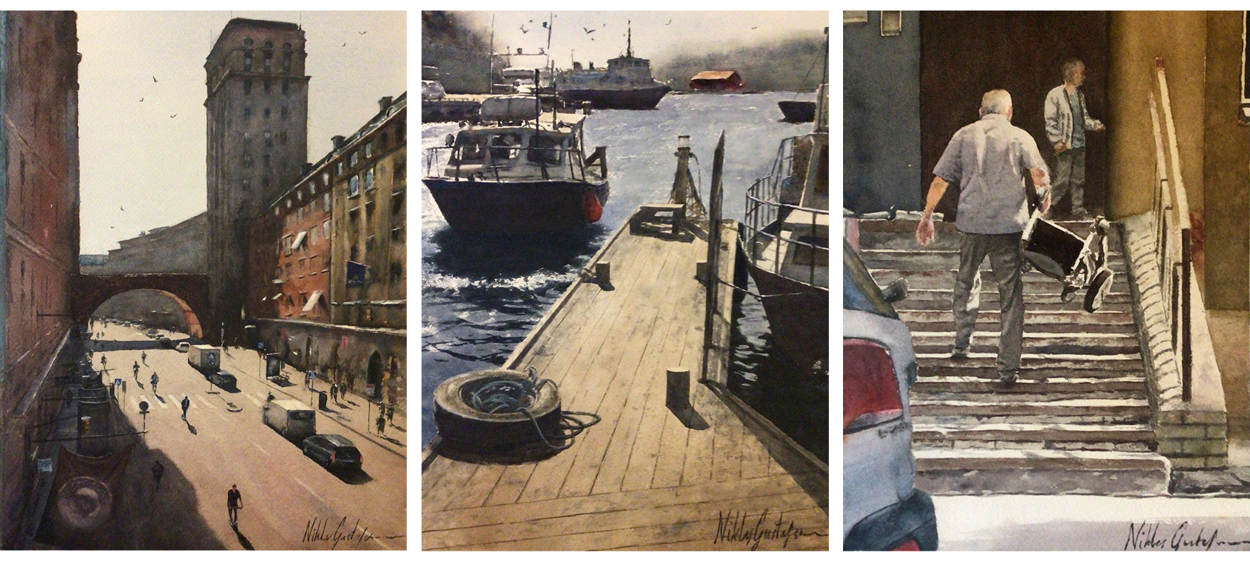 De myke akvarellene i vakre nyanser skapt av kunstneren Niklas Gustafsson, berører de fleste. Motivene er ofte byer, havner, mennesker og innimellom alt i samme maleri. Han velger ofte høyst realistiske fargeskalaer, hvor dunkle farger og skygger gir en retroduftende dybde. Det kan være et raskt øyeblikk eller en bygning som alltid har stått der, og totalt sett blir det et maleri laget med nøyaktig finesse, og med en så utrolig detaljrikdom at det nesten ligner et fotografi.