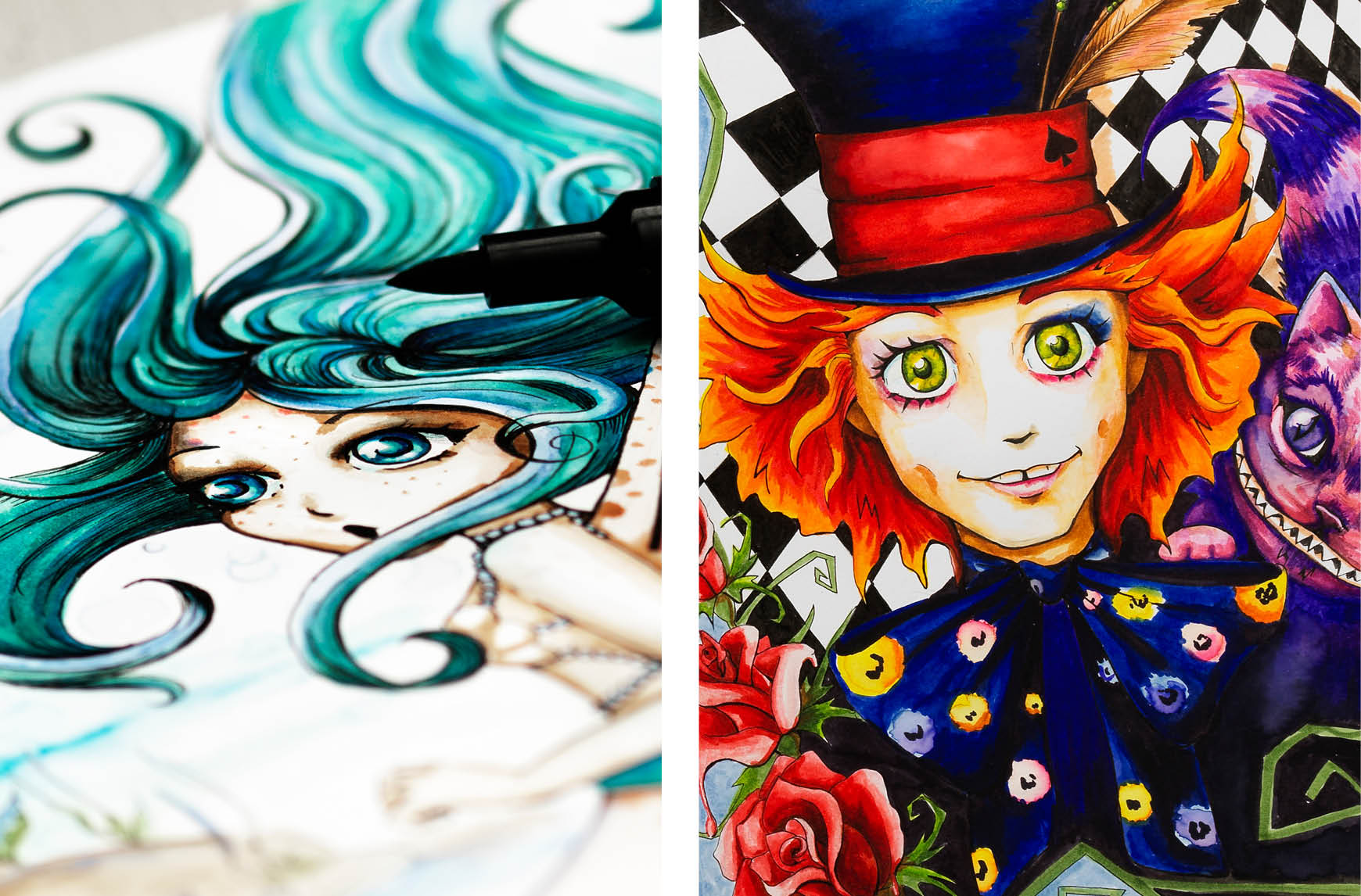 Copic – alkoholbaserte markers med utbyttbare spisser, twin-tip, med smal penselspiss i den ene enden og skrå meisel / kiselspiss i den andre.