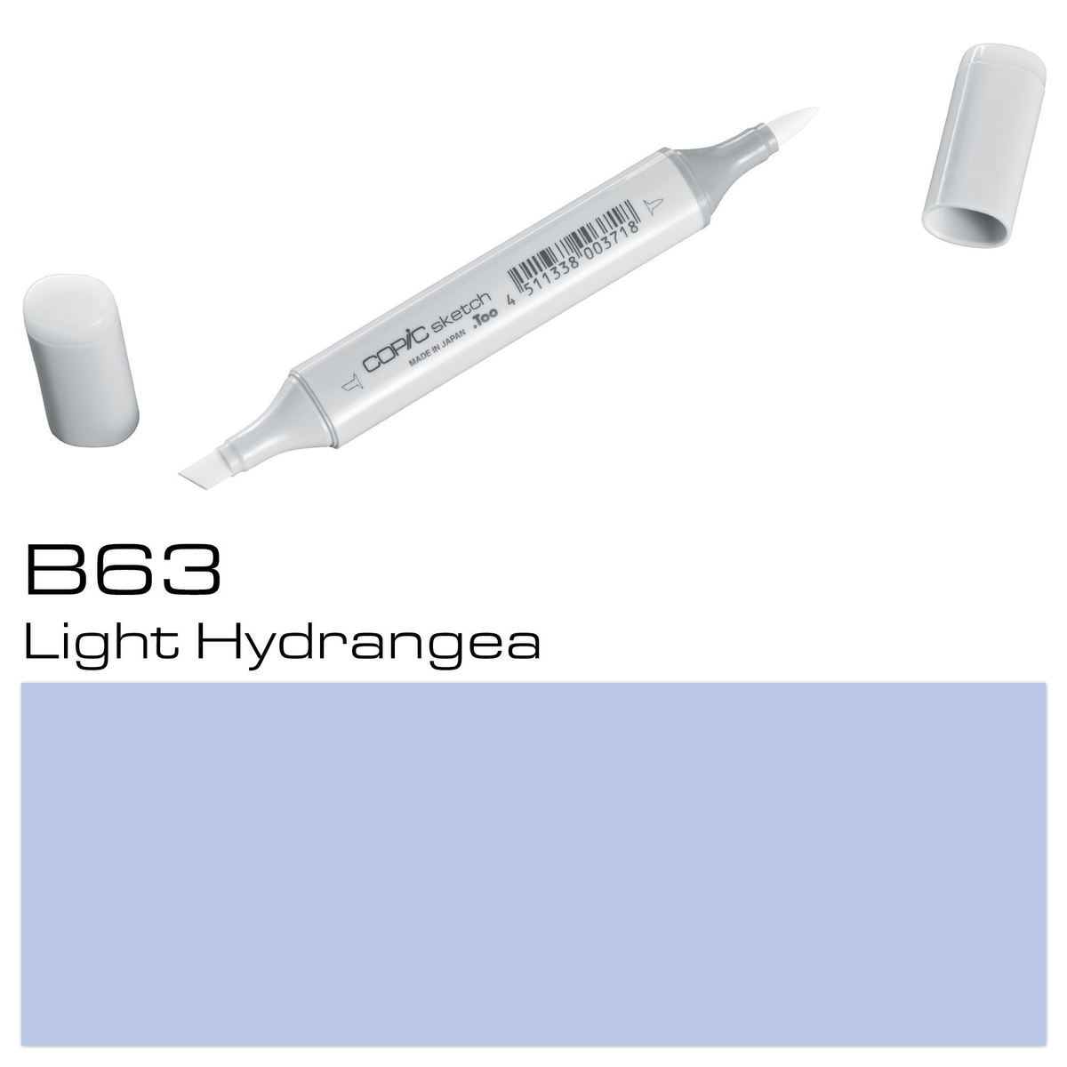Copic Sketch B, tusjpenner i blå farger. Copic Sketch er en tusj for fargelegging med to ulike spisser, medium bred (2–6 mm) og penselspiss (Super Brush). En alkoholbasert og hurtigtørkende spesialpenn som er permanent og syrefri. Fargekodede hetter. Løse spisser kan kjøpes som ekstra tilbehør. Pris per stk. Light Hydrangea