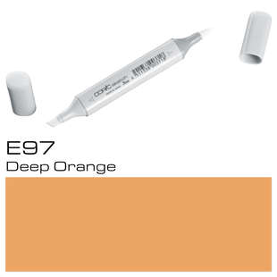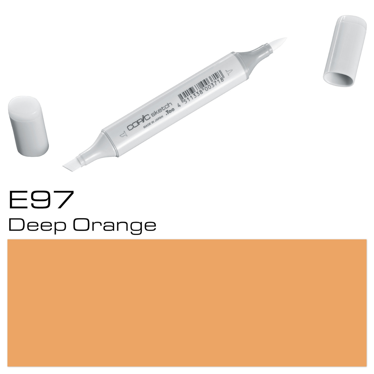 Copic Sketch E, tusjpenner i jordtoner (earth). Copic Sketch er en tusjpenn for fargelegging med to ulike spisser, medium bred (2–6 mm) og penselspiss (Super Brush). En alkoholbasert og hurtigtørkende spesialpenn som er permanent og syrefri. Fargekodede hetter. Løse spisser kan kjøpes som ekstra tilbehør. Pris per stk. Deep Orange