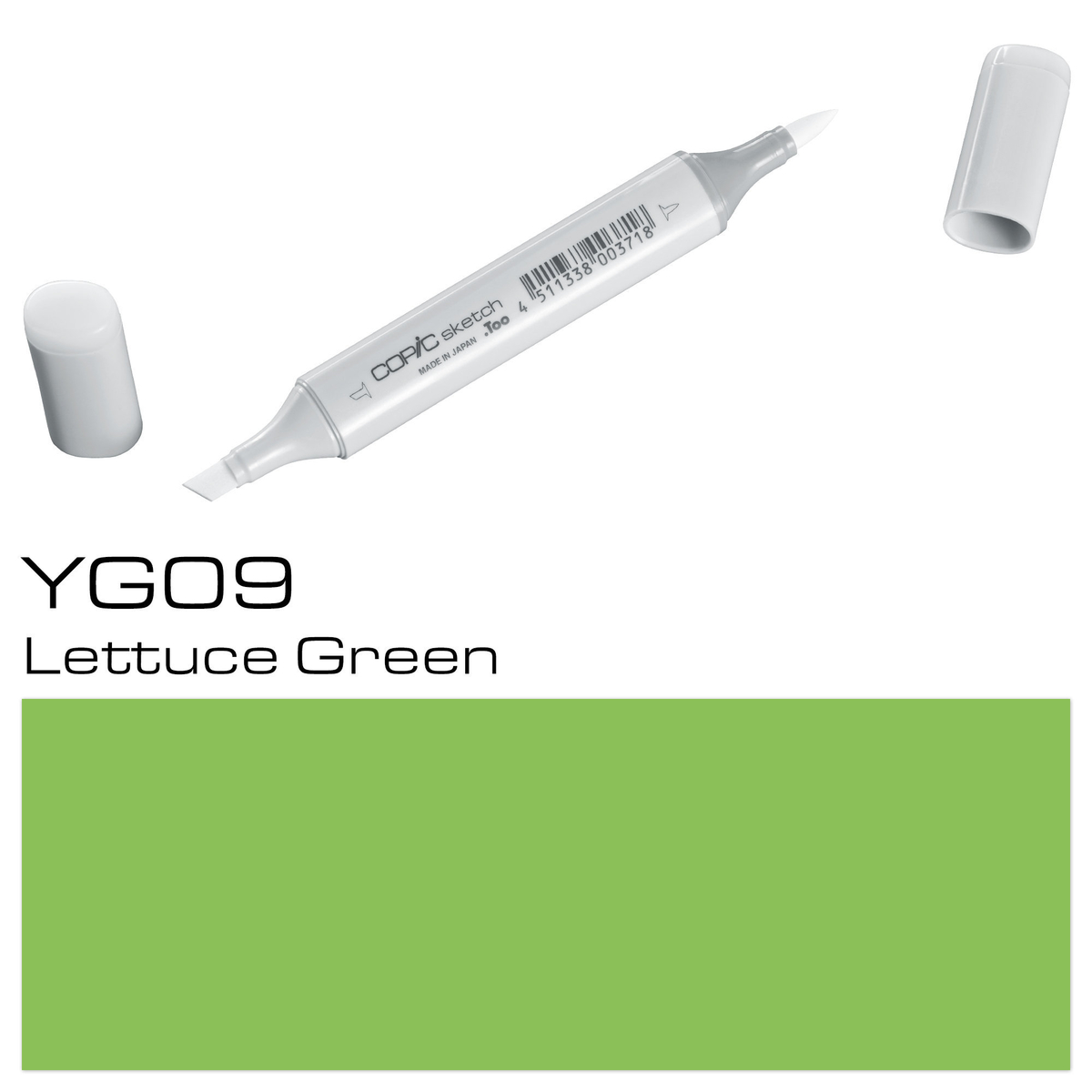 Copic Sketch YG, tusjpenner i gule/grønne farger. Copic Sketch er en tusj for fargelegging med to ulike spisser, medium bred (2–6 mm) og penselspiss (Super Brush). En alkoholbasert og hurtigtørkende spesialpenn som er permanent og syrefri. Fargekodede hetter. Løse spisser kan kjøpes som ekstra tilbehør. Pris per stk. Lettuce Green