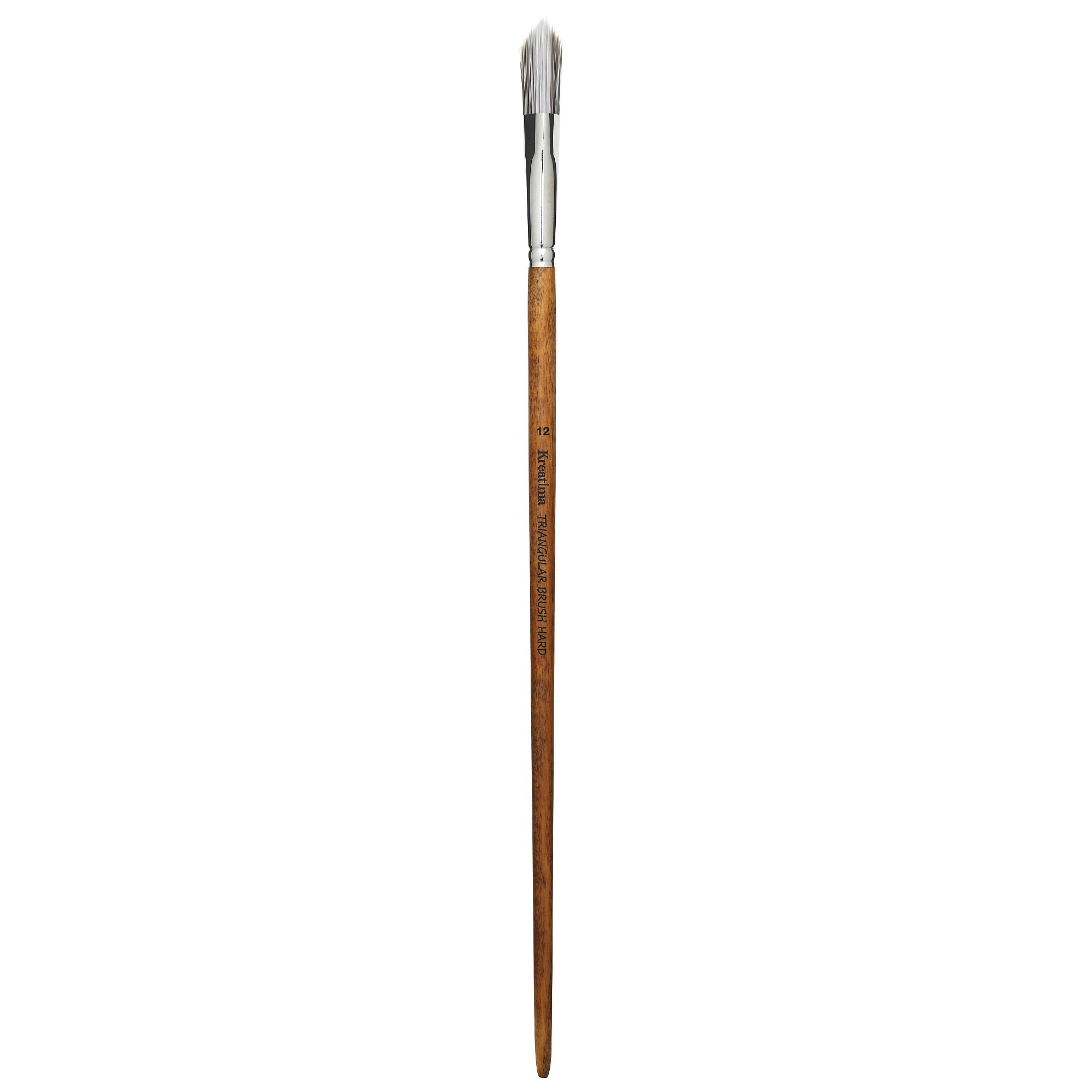 Jo, det spesielle med en triangelpensel er at busten er likesidet triangelformet, men også skråskjært – noe som muliggjør dristige penselstrøk og fargefordeling, ikke helt ulikt kalligrafi, bare med hele motiver og fargelegging i tankene. Busten er hard / stiv for å kunne jobbe med store mengder olje- og akrylmaling uten å miste formen / presisjonen.