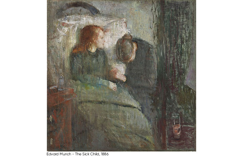 I ett försök att förstå Munchs melankoliska och stundtals råa skildringar av livet behöver vi gå tillbaka några år, till hans barndom och uppväxt. När Edvard är endast fem år blir hans mor sjuk och avlider. Även hans syster dör när Edvard är ung och till familjen Munchs undsättning kommer mostern Karen Bjølstad som flyttar in hos familjen i deras lägenhet i Kristiania (idag Oslo). Det sägs att det var Karen, själv konstnär, som introducerade unge Edvard för konsten. Det är också hans egen familj som verkar föremål för fler av hans verk, som tidigare nämnda Det sjuka barnet, där figurerna som porträtteras sägs vara inspirerade av systern och mostern.