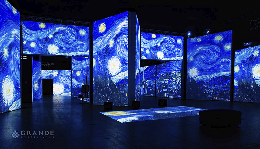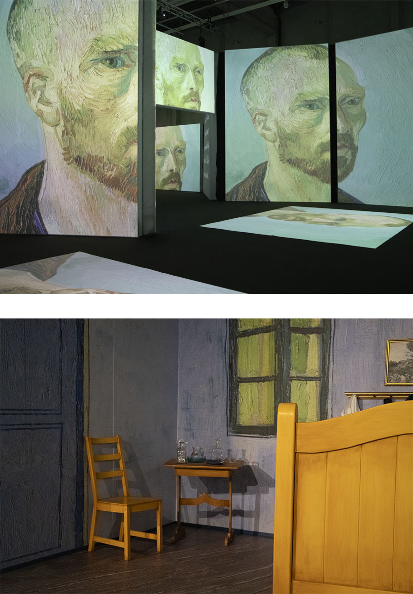 Efter en inledande del får man äntligen bege sig in i det magiska Sensory4™-galleriet. Här känns det som att kliva rätt in i van Gogh målande värld – där vi får ta del av konstverk såsom Stjärnenatt, Blommande mandelgrenar och hans många personporträtt. Genom att konstverket rör på sig och musikstycken dånar blir vi ett med van Goghs bild av sin omvärld. Blommor, landskap, natur och allehanda bildskön miljö kommer till liv.
