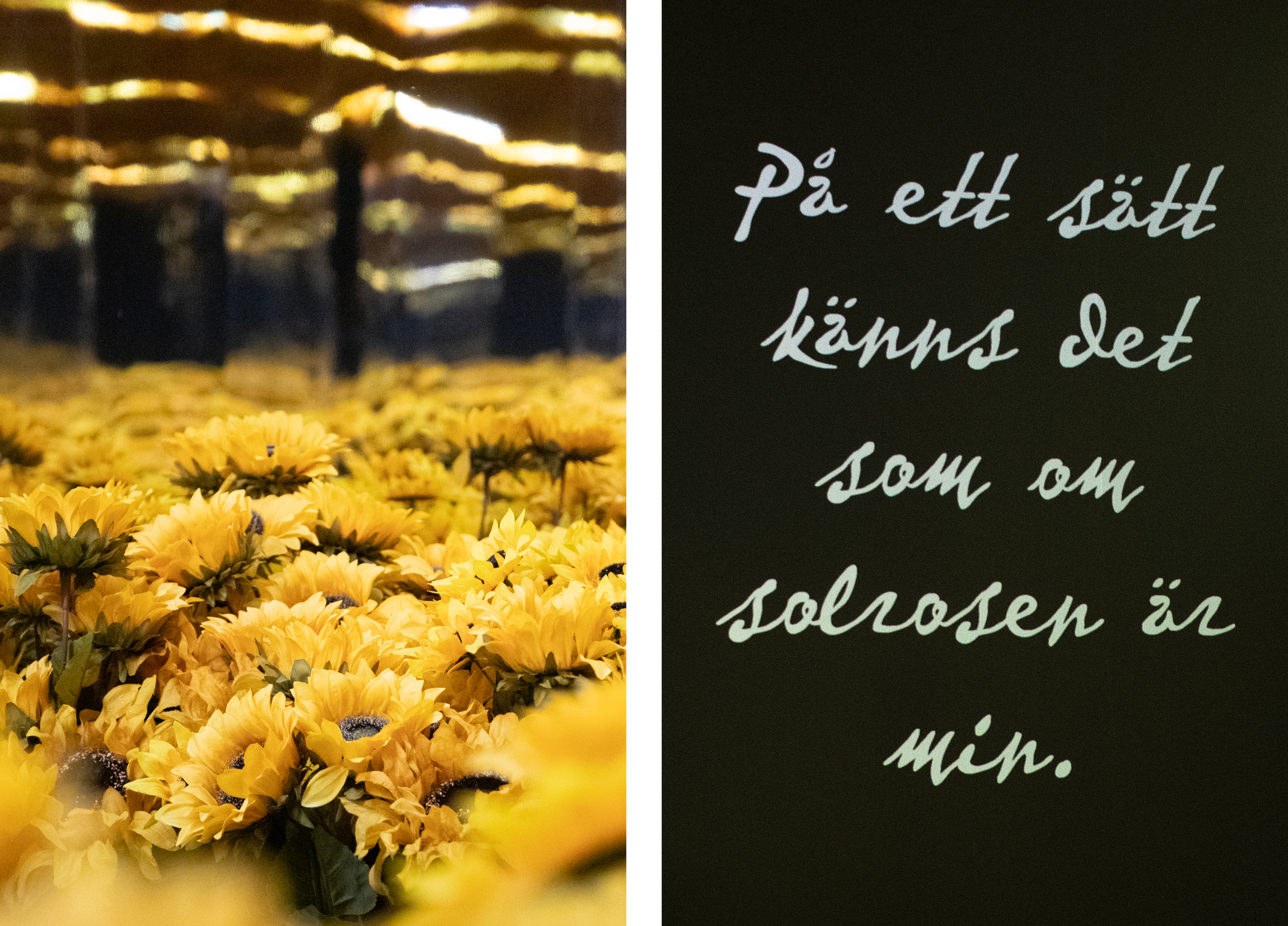 Slutligen kommer man till det som van Gogh kanske är allra mest känd för – solrosor. Här samlas hundratals solrosor tillsammans med speglar vilket ger en magisk effekt av ett enda stort och härligt fält av solrosor. Sammantaget är helt utställningen en nytänkande variant av en konstutställning – sällan har man känt sig så ”nära” verket och dess upphovsperson.