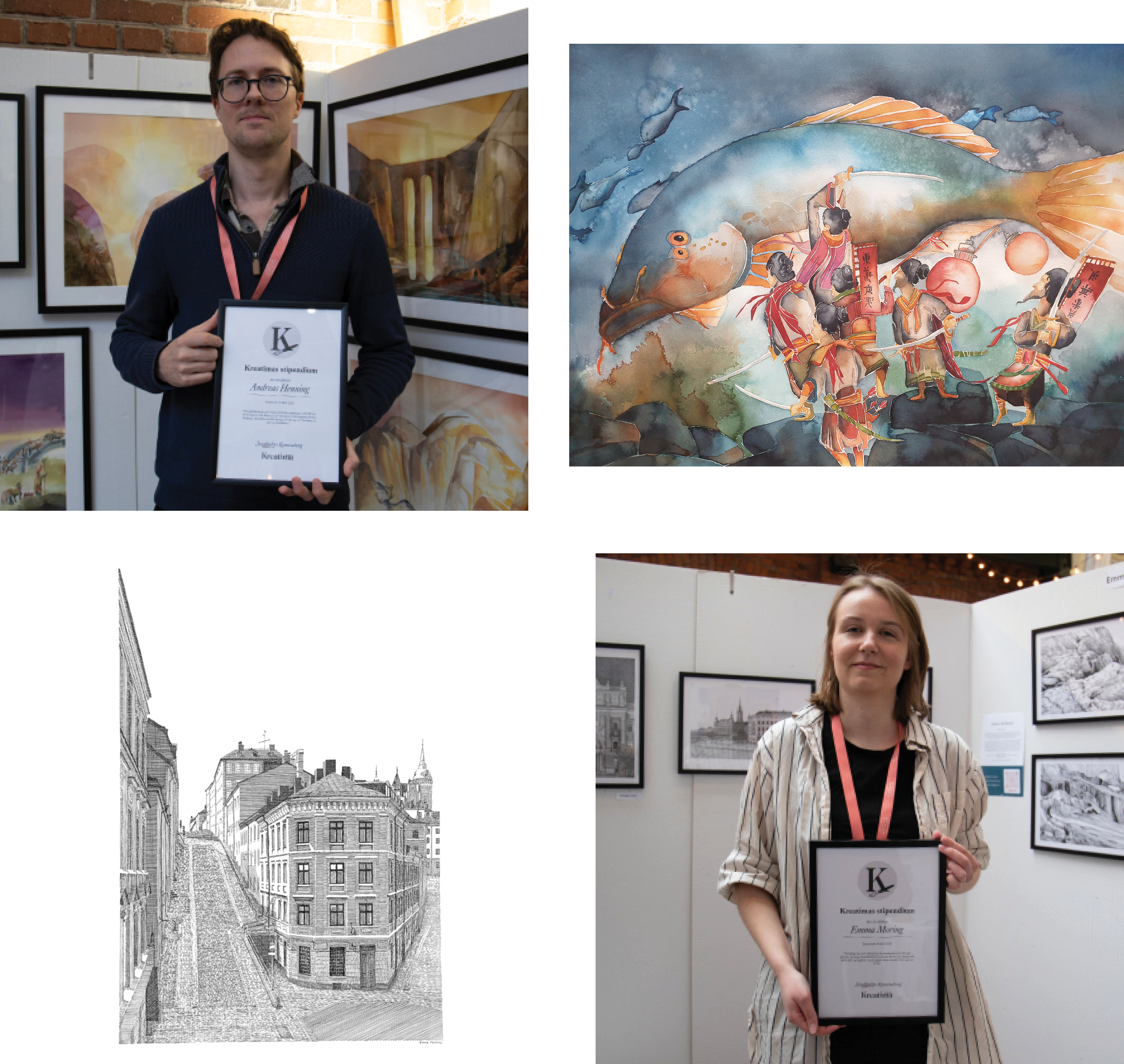 2025 gick årets stipendier till två konstnärer som verkligen imponerade på vår jury. Vår första vinnare, Andreas Henning (andreashenning.se), skapar häpnadsväckande akvarellmålningar med inspiration från resor, fantasy-världar och datorspel. Vi motiverade stipendiet med följande motivering: "Färgsprakande och medryckande målningar som för en till en annan tid. Bara av att betrakta målningarna kittlar Andreas akvarellverk ens fantasi till att se och fundera ut en hel berättelse".
