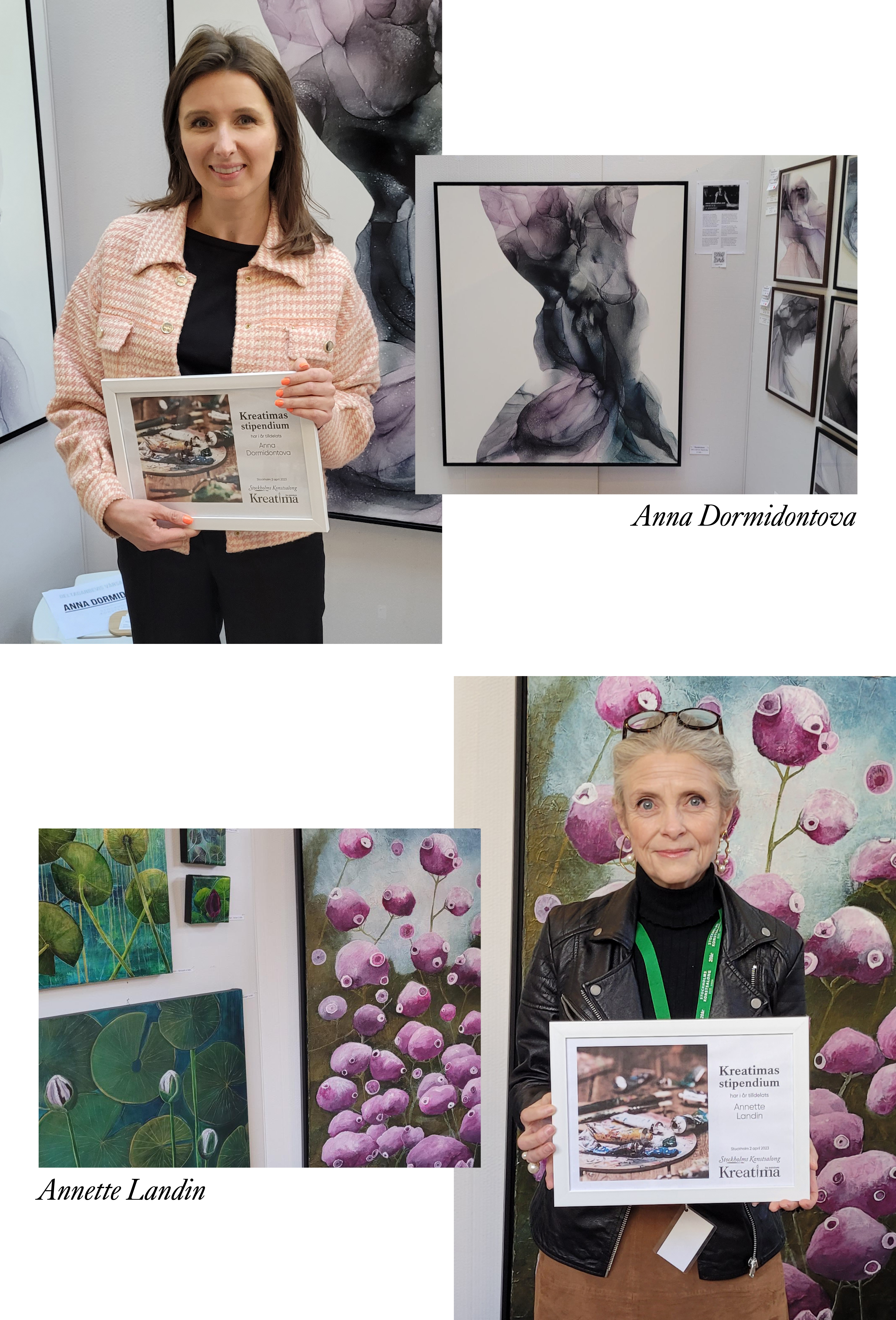 I år gick Kreatimas stipendier till två konstnärer som vardera skapar på sitt eget unika vis. Den första vinnaren som valdes ut i år var konstnären Anna-Karin Bergius, som målar effektfullt och abstrakt med inspiration av naturen på Gotland. Hon använder ofta akrylfärg eller oljepastellkrita i sina dramatiska målningar. Vår motivering lyder: