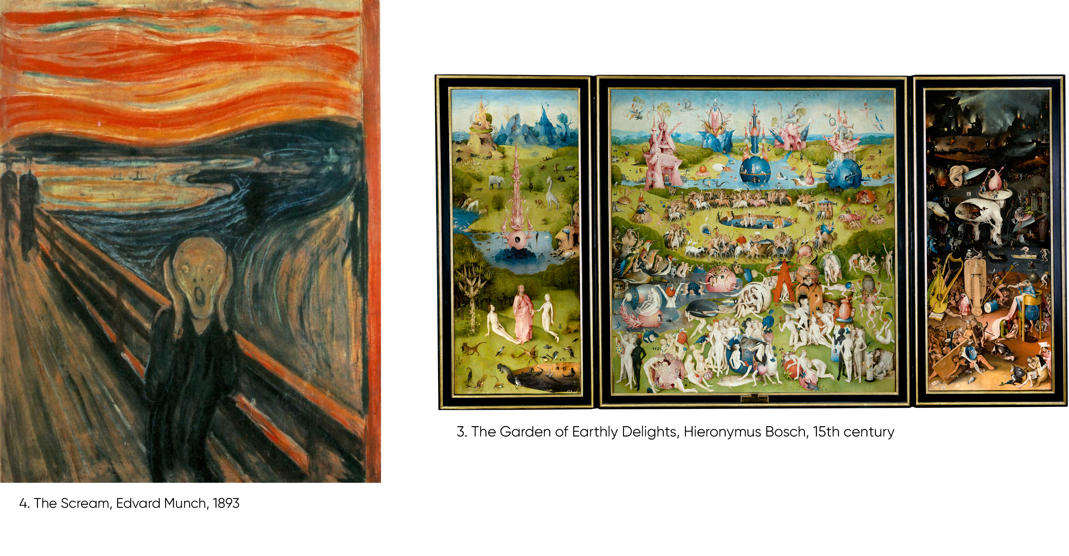 ”Skriet” är kanske en av världshistoriens mest kända konstverk och målades av norska Advard Munch i fyra versioner samt en litografi. Verket är lite otippat målat direkt på papp, med oljefärg, kritor, pastell och kritor som verktyg. Himlen tycks lysa starkt i rött och orange medan det i förgrunden syns en skrikande gestalt som håller händerna längst med kinderna. Förutom Skriet finns det även den snarlika oljemålningen Förtvivlan (1894), där den hattprydda och uttryckslösa gestalten istället är bortvänd. Dessutom återfinns även en tredje känsla, Ångest (1894) där karaktärerna har grönaktigt spöklika utseenden. Alla verken binds samman av sin ”brinnande” natthimmel och ingår allihop i konstserier ”Livsfrisen” som Munch skapade för att just skildra människans ångest.