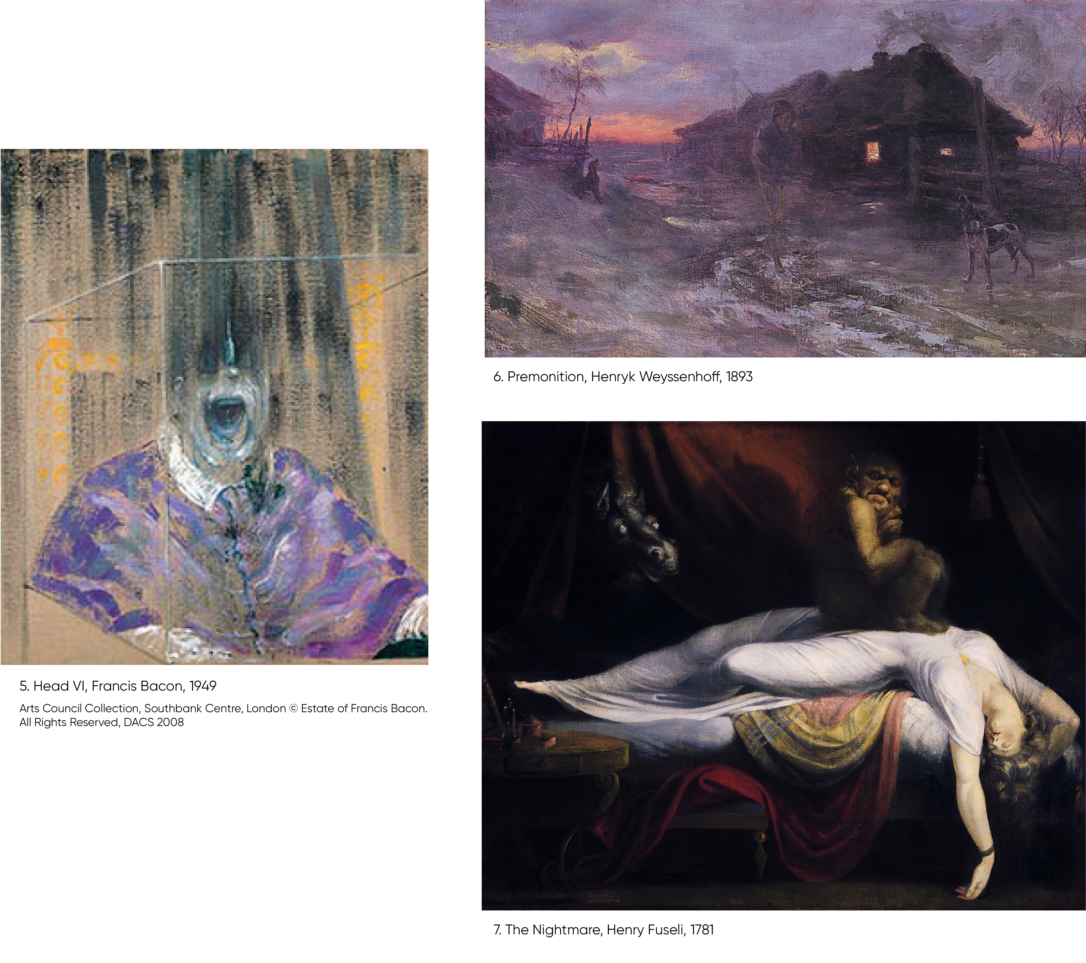 Här följer några tavlor där skräck förekommer i mer eller mindre utsträckning. OBS! Skrämmande bilder förekommer.