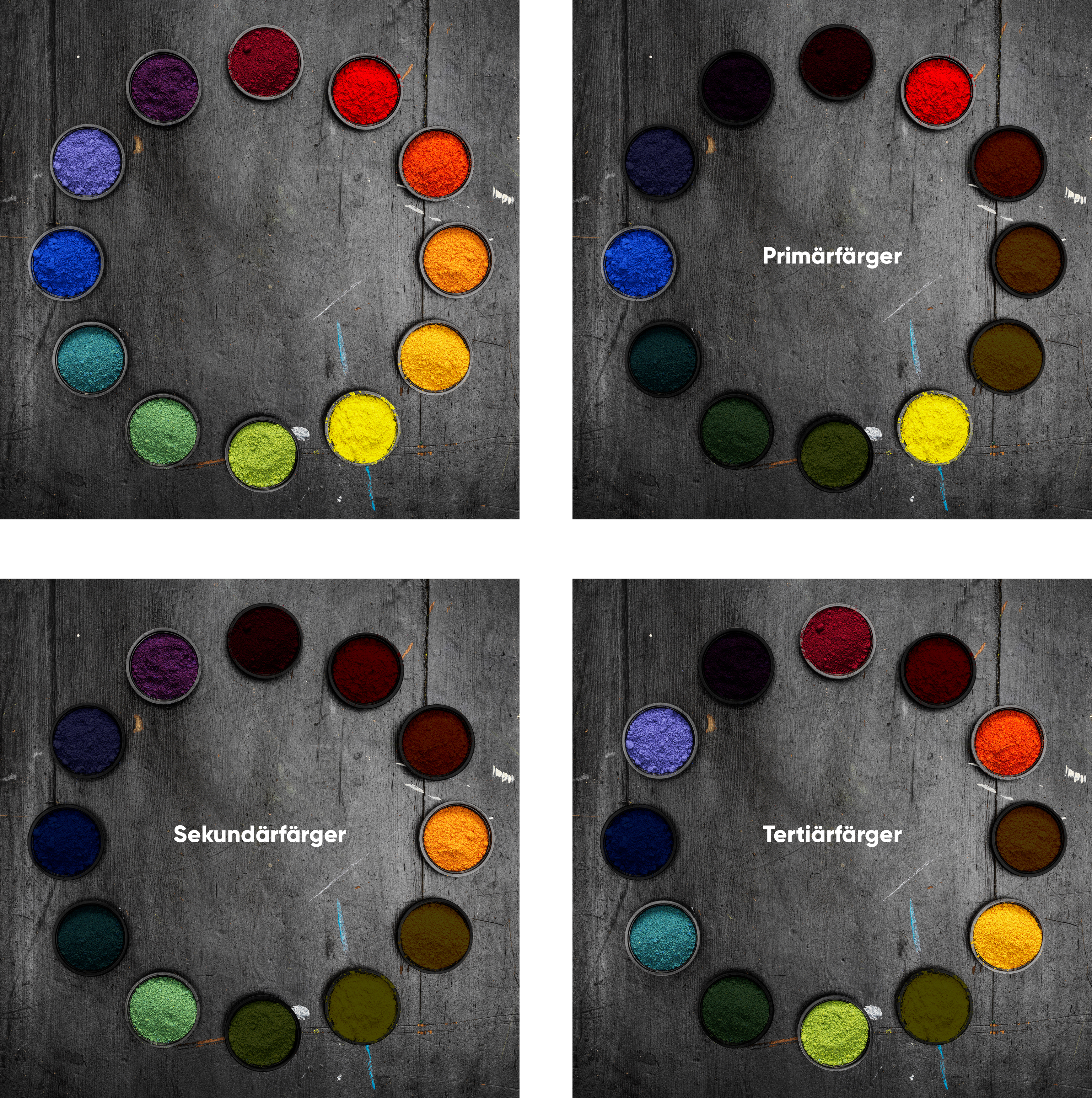 Tertiärfärger – Dessa färger uppstår när man blandar primär- och sekundärfärger. Exempel på tertiärfärger är gulgrönt, blågrönt och röd-orange.