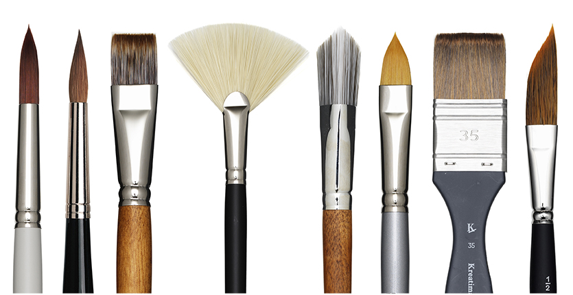 Till akvarellfärg – här behöver du vara noga vid ditt val av penslar, speciellt om du vill arbeta med mycket vatten. Det väsentliga är att ha en basuppsättning av penslar som kan bära mycket vatten och färg, så håll utkik efter lite tjockare borstar som smalnar av mot toppen. Eftersom du även kommer att måla linjer och detaljer kan det också vara en god idé att införskaffa mindre och spetsiga penslar.