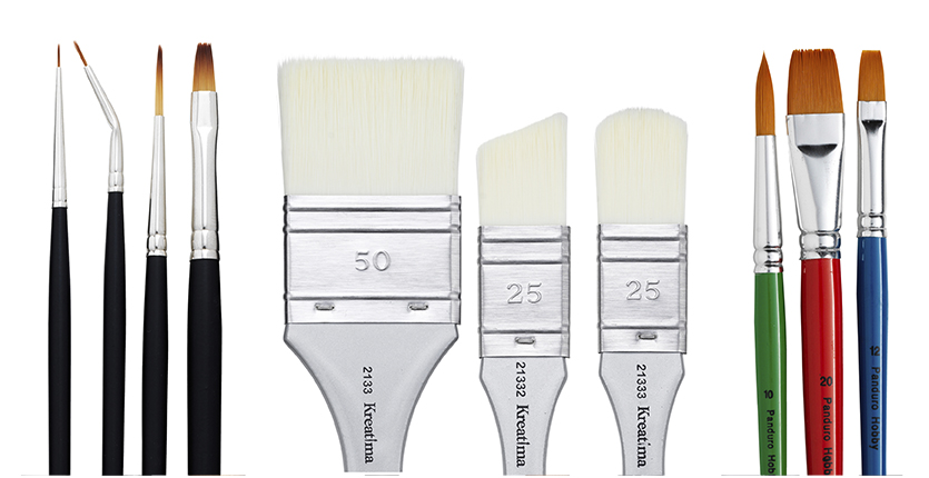 Till akrylfärg – de flesta penslar som passar till oljefärg passar även fint till akrylfärg. Är du nybörjare kan du börja med en större uppsättning syntetpenslar då de klarar av den tunga färgen med bravur. Eftersom akrylfärg stelnar och är ej vattenlöslig när den torkar kan det vara en bra idé att inte börja med de dyraste penslarna ifall du skulle glömma att skölja av dem ordentligt.
