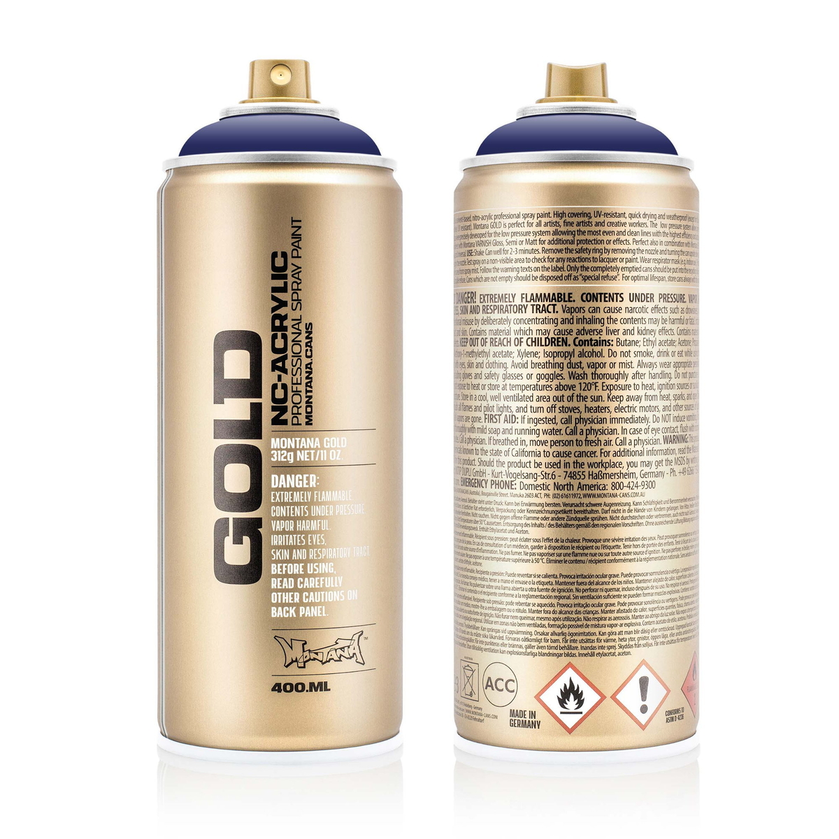 Montana Gold är en mycket användbar akrylbaserad sprayfärg – högtäckande, med silkesmatt finish och funkar på de flesta målningsbara underlag även canvasdukar. Färgsortimentet är stort och kompletteras med diverse tekniska sprayer, t.ex. primers och olika klarlack. Sprayburken är lätt att kontrollera med sitt låga tryck och ett specialutvecklat valvsystem som gör det enkelt att måla även mindre detaljer.