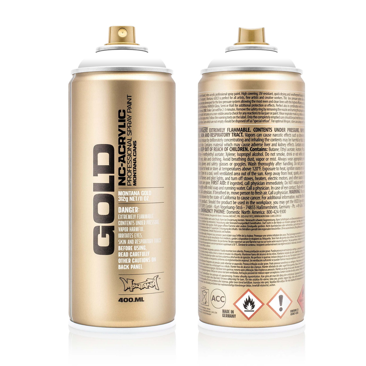 Montana Gold är en mycket användbar akrylbaserad sprayfärg – högtäckande, med silkesmatt finish och funkar på de flesta målningsbara underlag även canvasdukar. Färgsortimentet är stort och kompletteras med diverse tekniska sprayer, t.ex. primers och olika klarlack. Sprayburken är lätt att kontrollera med sitt låga tryck och ett specialutvecklat valvsystem som gör det enkelt att måla även mindre detaljer.