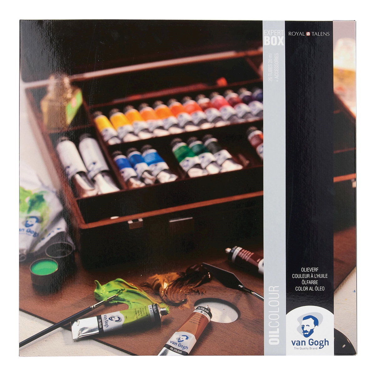 Van Gogh Expert Box är ett exklusivt träskrin innehållande 24 tuber à 20 ml, 2 tuber à 60 ml, Medium 75 ml, Terpentin 75 ml, Varnish glossy 75 ml, 3 Van Gogh penslar, dubbel palettkopp, träpalett, målarkniv, rengöringsduk, 3 ritkol samt en färgblandnings broschyr.Detaljerad information om färgerna som ingår hittar du på färgkartan.